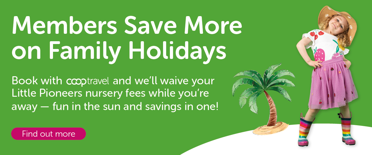 Spend over £2,000 when you book a family holiday through Co-op Travel and we won't charge you your Little Pioneers nursery fees whilst you're away (terms and conditions apply).