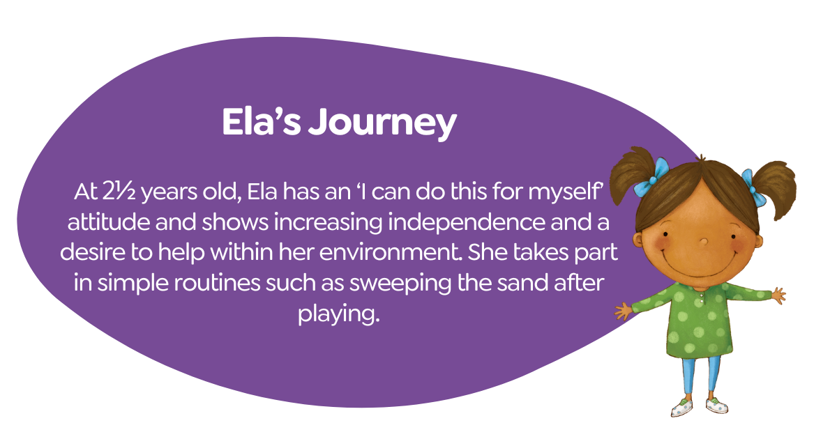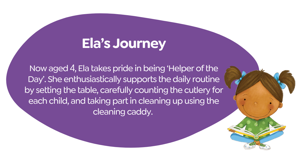 Toddlers begin to develop independence and resilience through their everyday routines and meaningful interactions at nursery. Mealtimes provide opportunities to learn about healthy eating, where food comes from, and the importance of a balanced diet, while conversations about likes, dislikes, and home meals encourage communication.